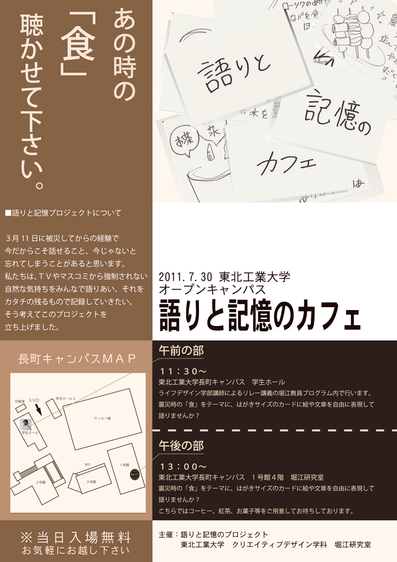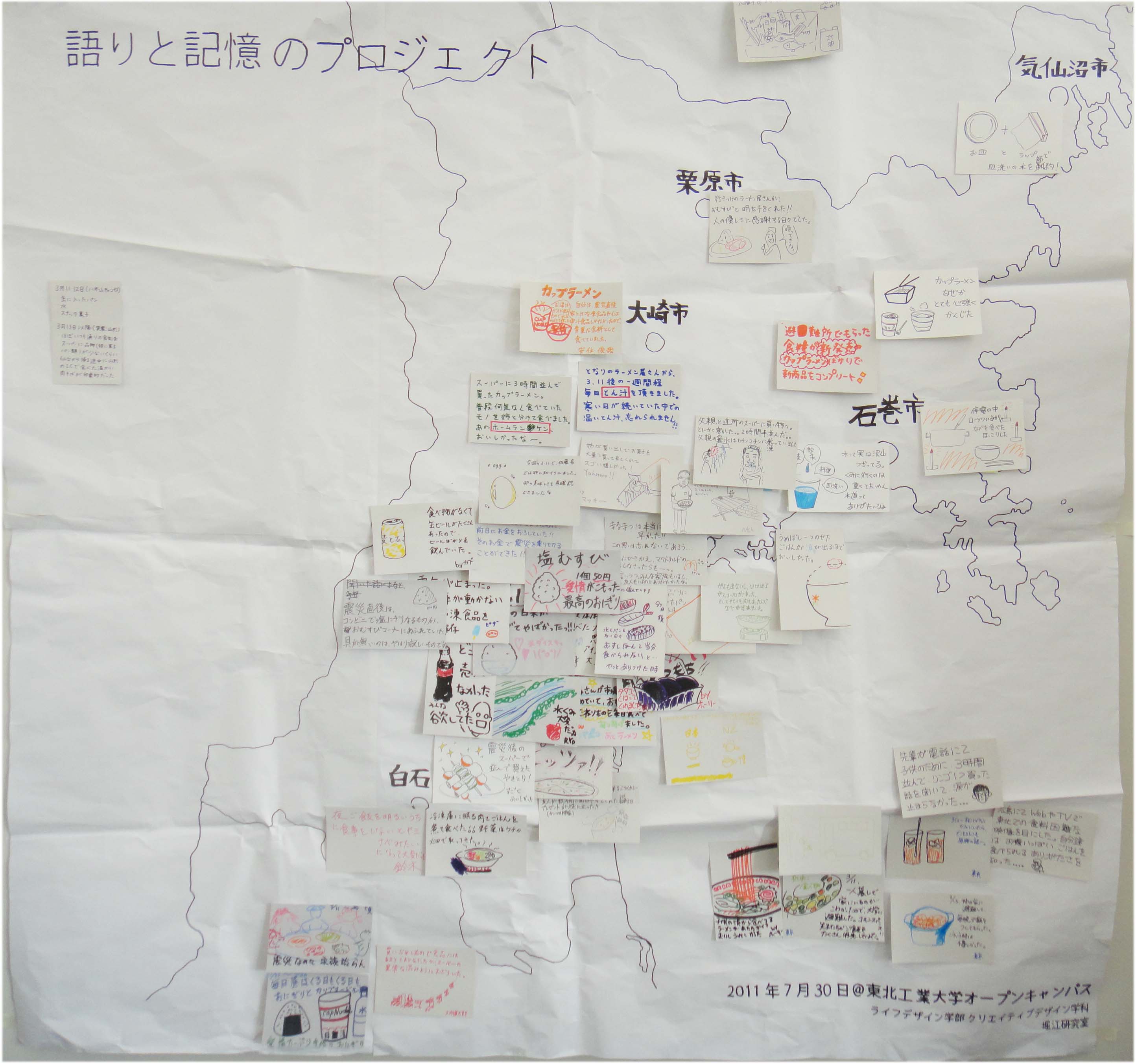内 容:参加者はお茶とお菓子を楽しみながら、カードに震災時の食に関するエピソードを文字と絵で書き、そのカードについて語った。参加者の作ったカードを宮城県とその周辺の白地図に貼り、場所によるカード内容の比較を行った。カードの総計は47枚(30人)。普段は手に入ることが当たり前だと思っていたモノが、なかなか手に入らない辛さについて参加者は共感していた。