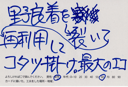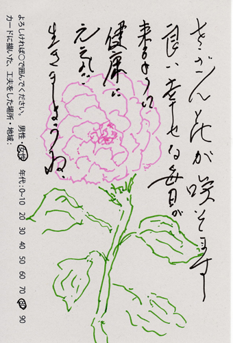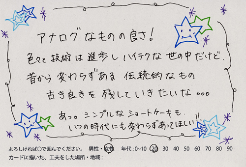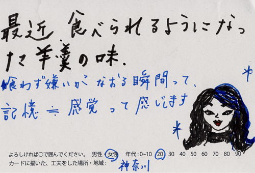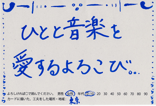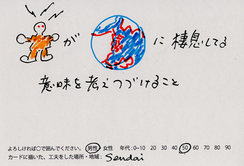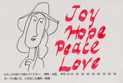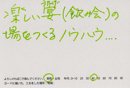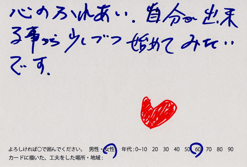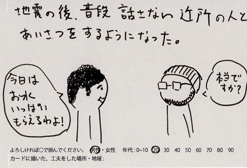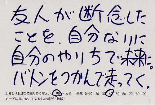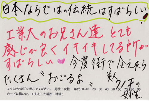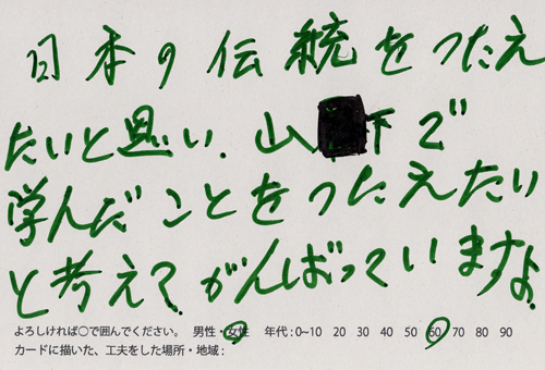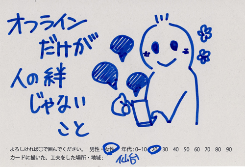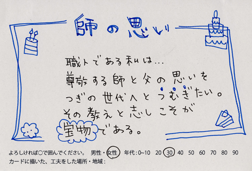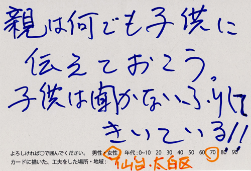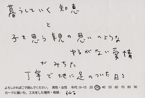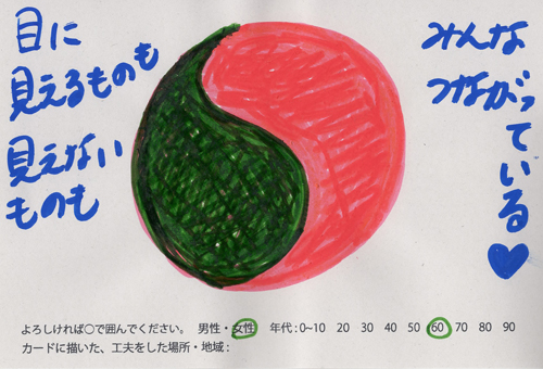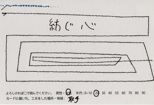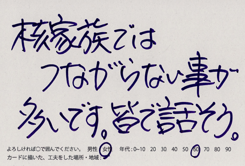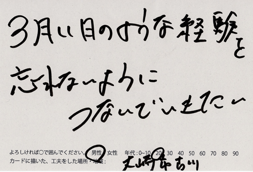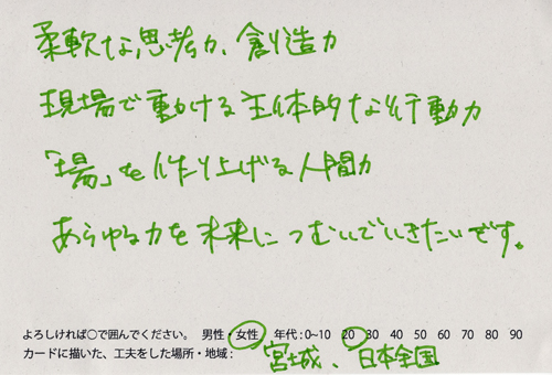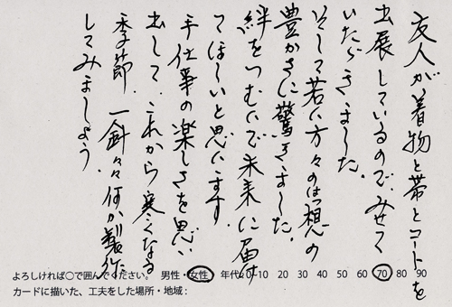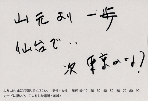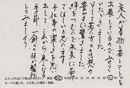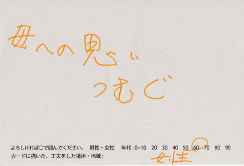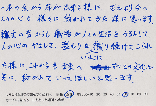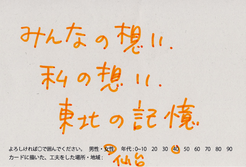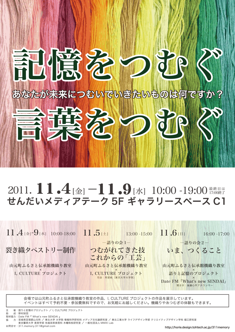 内 容:会場では、山元町ふるさと伝承館機織り教室の作品の展示と、I, CULTUREプロジェクトの作品展示をし、来場者は機織り体験と糸紡ぎ体験をしてもらった。来場者にテーマに関するモノ・コトをカードに書いてもらい、それについてスタッフに語ってもらった。カードの総計は120枚(展覧会来場者400人)。震災の中で家族と過ごしたこと、周りの人とどのように連携をとったかなどが「これからにつむいでいきたいこと」として多く語られていた。