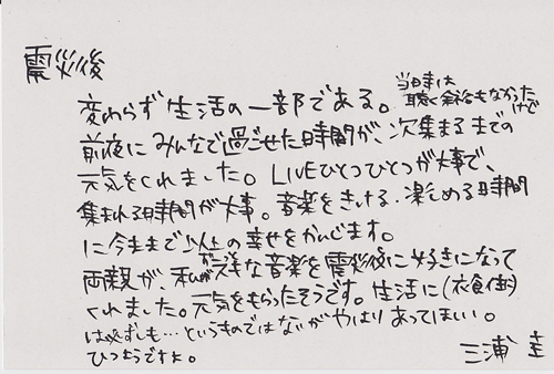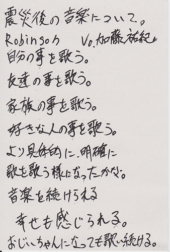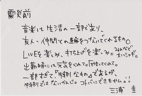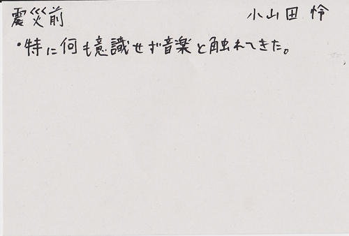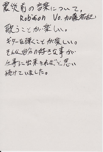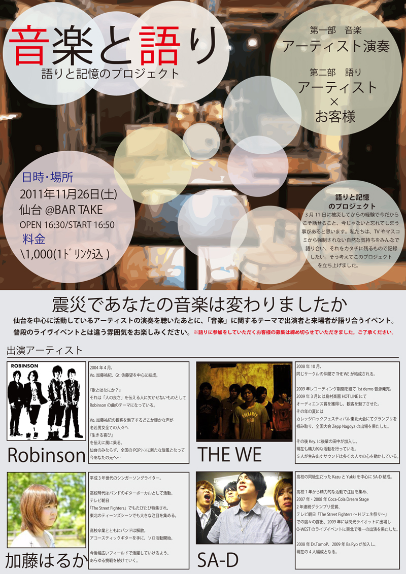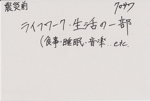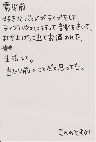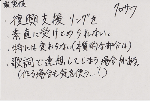 内 容:2部構成で実施した。1部は仙台を中心に活動しているアーティスト4組のライブ演奏を行い、2部はアーティストのメンバーと来場者がテーマに関することをカードに書き、語り合い、「震災前・震災後」に分けた地にカードを貼付けて共有した。カードの総計は39枚(30人)。来場者からは、「震災前はただ音楽を聴くのが好きだったが、震災後はライブに行って演奏を聴くのが楽しくて大切な時間だと思った」といった語りがあった。アーティストからは、震災前は自分の為に歌っていたが、震災後には他の誰かの為に歌うようになったという語りがあった。いつものライブ後の打ち上げでは真面目に音楽について語り合うことはなかったが、今回、他メンバーの考えを知ることができたので、今後の音楽活動に影響を与えるかもしれないとういうコメントもあった。