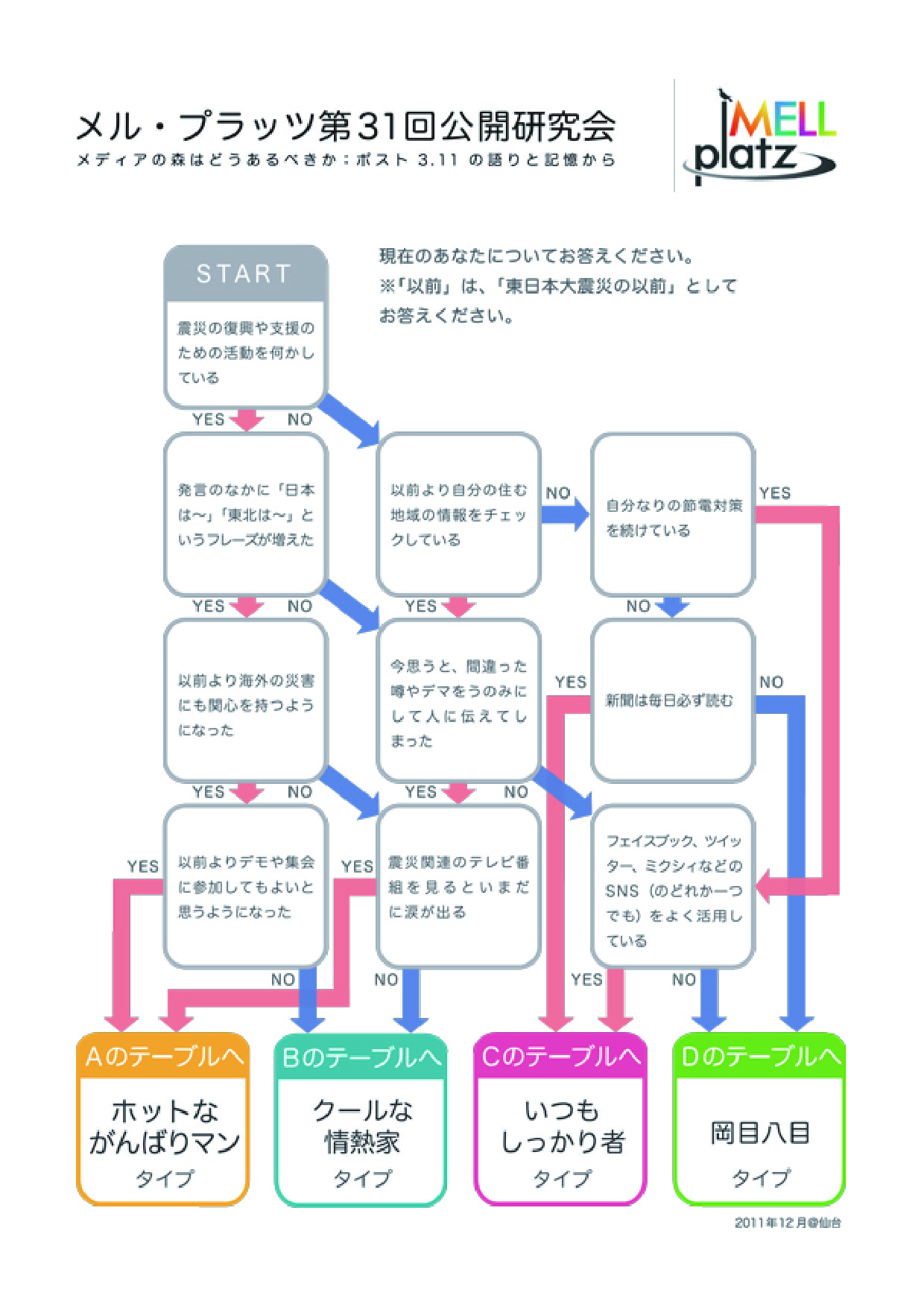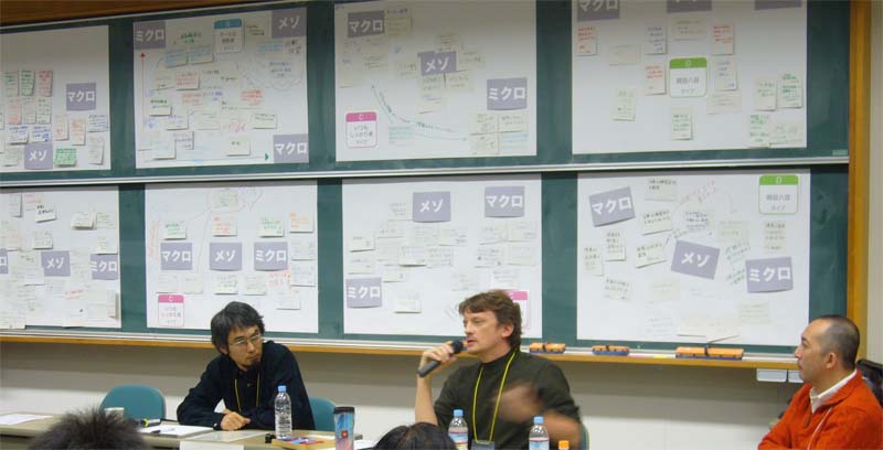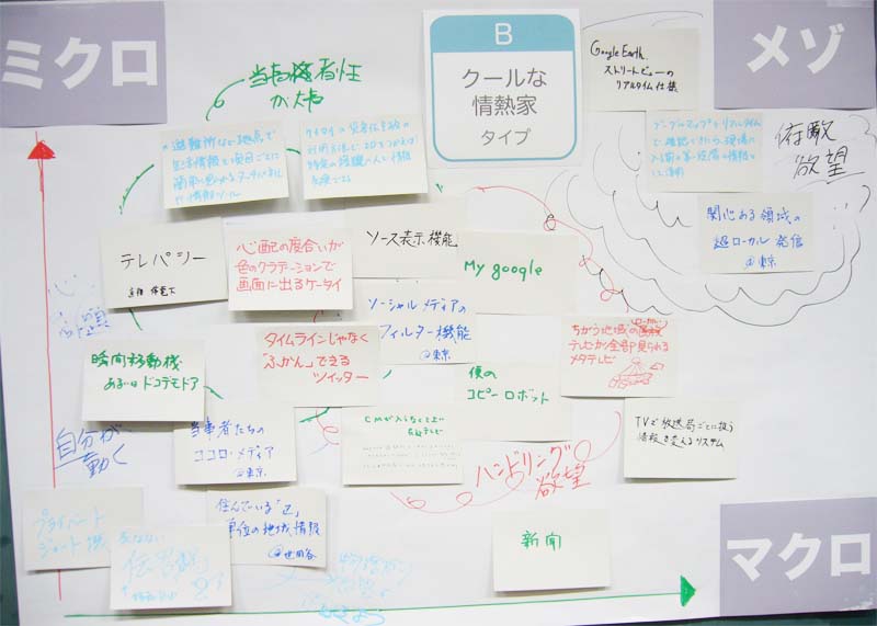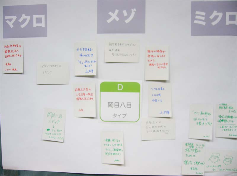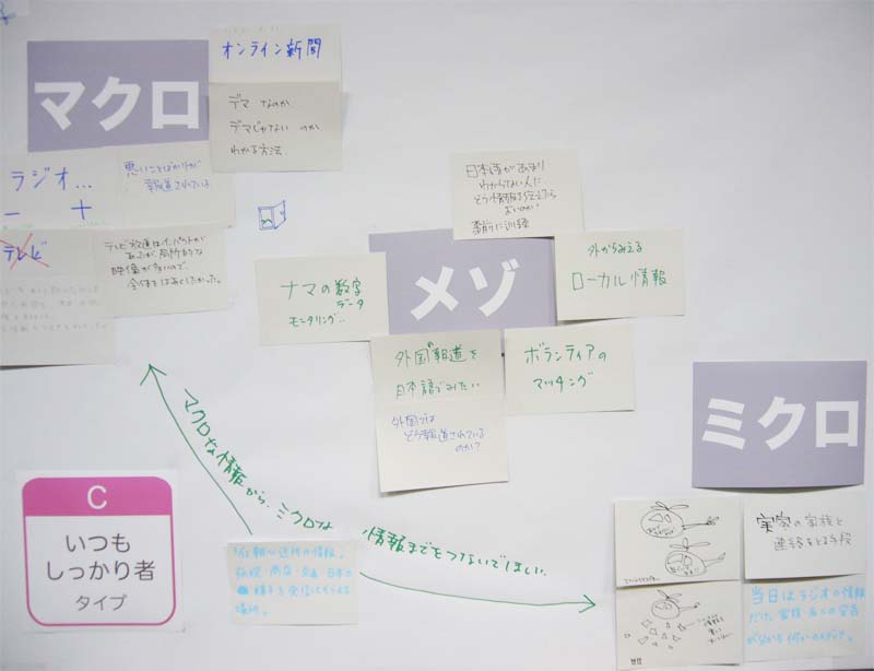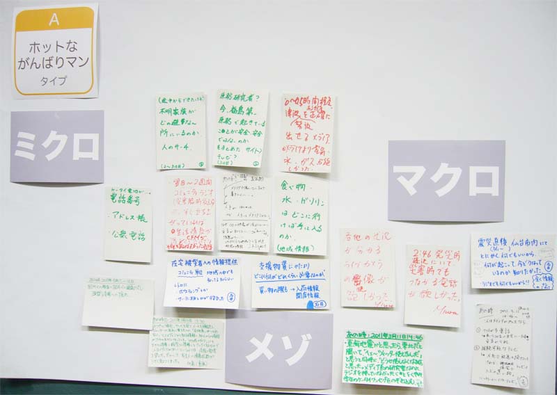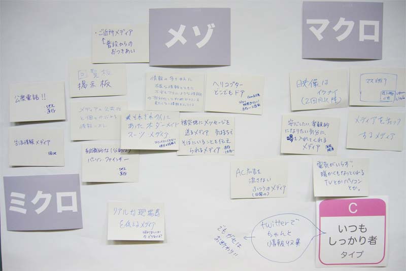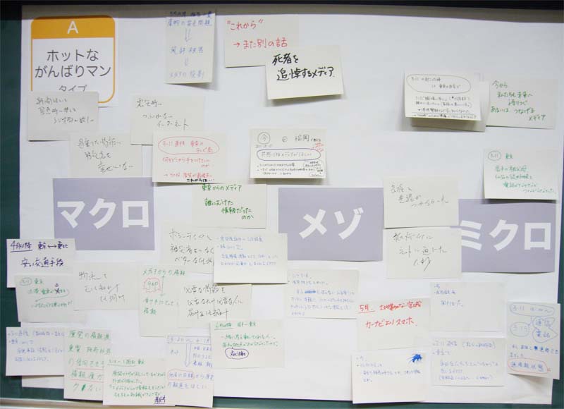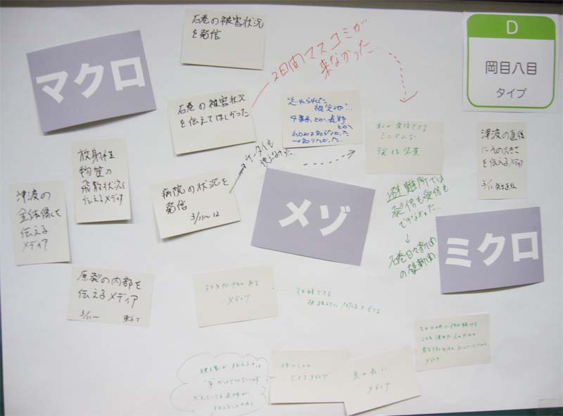 内 容:東日本大震災におけるメディア体験をふり返り、語り合うことを目的としている。参加者はチャートにより4つのタイプに分かれ、8つのグループで「あのとき、こんなメディアがほしかった」ということについて、メディア体験をカードに書いた。それらのカードを「マクロ・メゾ・ミクロ」の3つのキーワードで捉え、カードを配置しながら語り合った。カードの総計は147枚(50人)。これらの発表を踏まえて登壇者から、さまざまなメディアのあり方についての議論がなされた。